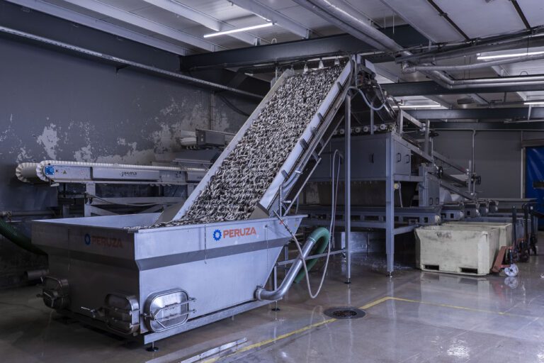 Incline conveyor is feeding fish to PERUZA Roller Grader