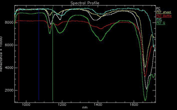 Polimēru materiāli ir vērtīga otrreizēja izejviela, taču tikai tad, ja tie nav sajaukti savā starpā. Īpaši izaicinoši ir ātri atšķirot caurspīdīgus polimēru materiālus, tādus kā PET, PET-G, PET sheet, PC, PVC. Pētījumos atklāts, ka pietiekami precīzi un ar saprātīgām izmaksām šo uzdevumu var veikt izmantojot hiperspekrālās kameras, kas analizē noteikta garuma gaismas starus tuvu infrasarkanajam spektram, kas atstarojas no materiāla. Pētījumu rezultātā ir veikts iepirkums, lai 2.aktivitatē “Eksperimentālā izstrāde” šo risinājumu ieviestu iekārtā. Attēlā parādītas histogrammas, kuras redzamas spektrālo līniju atšķirības, kas var palīdzēt korekti atpazīt dažādus polimēru materiālus.